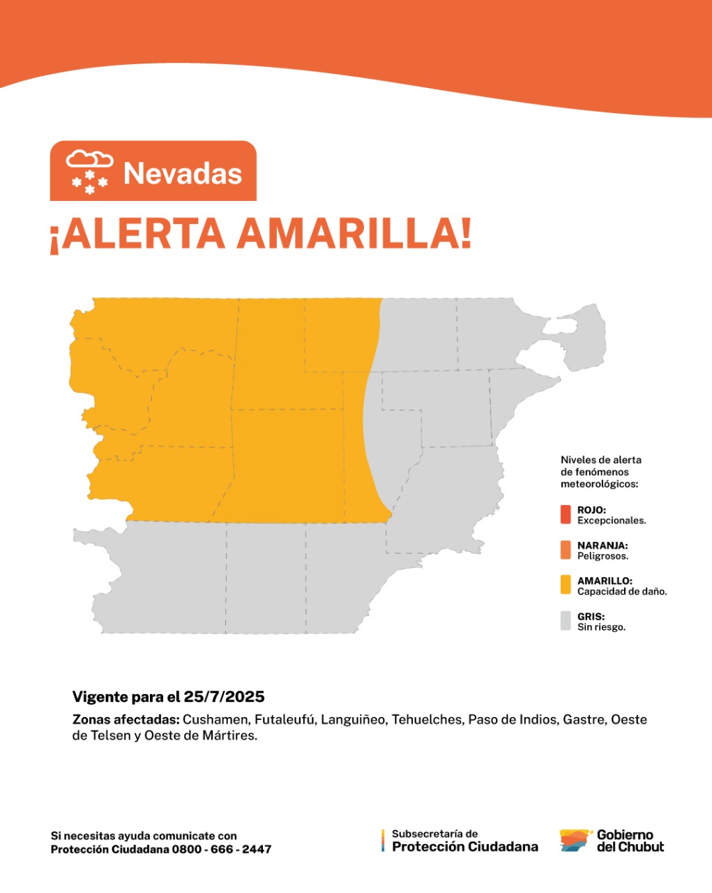 La Subsecretaría de Protección Ciudadana, dependiente del Ministerio de Seguridad y Justicia, informa sobre la zona de cobertura de el alerta amarilla por nevadas, emitido por el Servicio Meteorológico Nacional prevista para la mañana – mediodía del viernes 25 de julio.