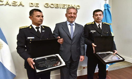 El Gobernador del Chubut, Mariano Arcioni, entregó una placa de reconocimiento al ex jefe de Policía, Miguel Gómez, y subjefe, Néstor Gómez Ocampo, por el trabajo desarrollado al frente de la fuerza provincial.