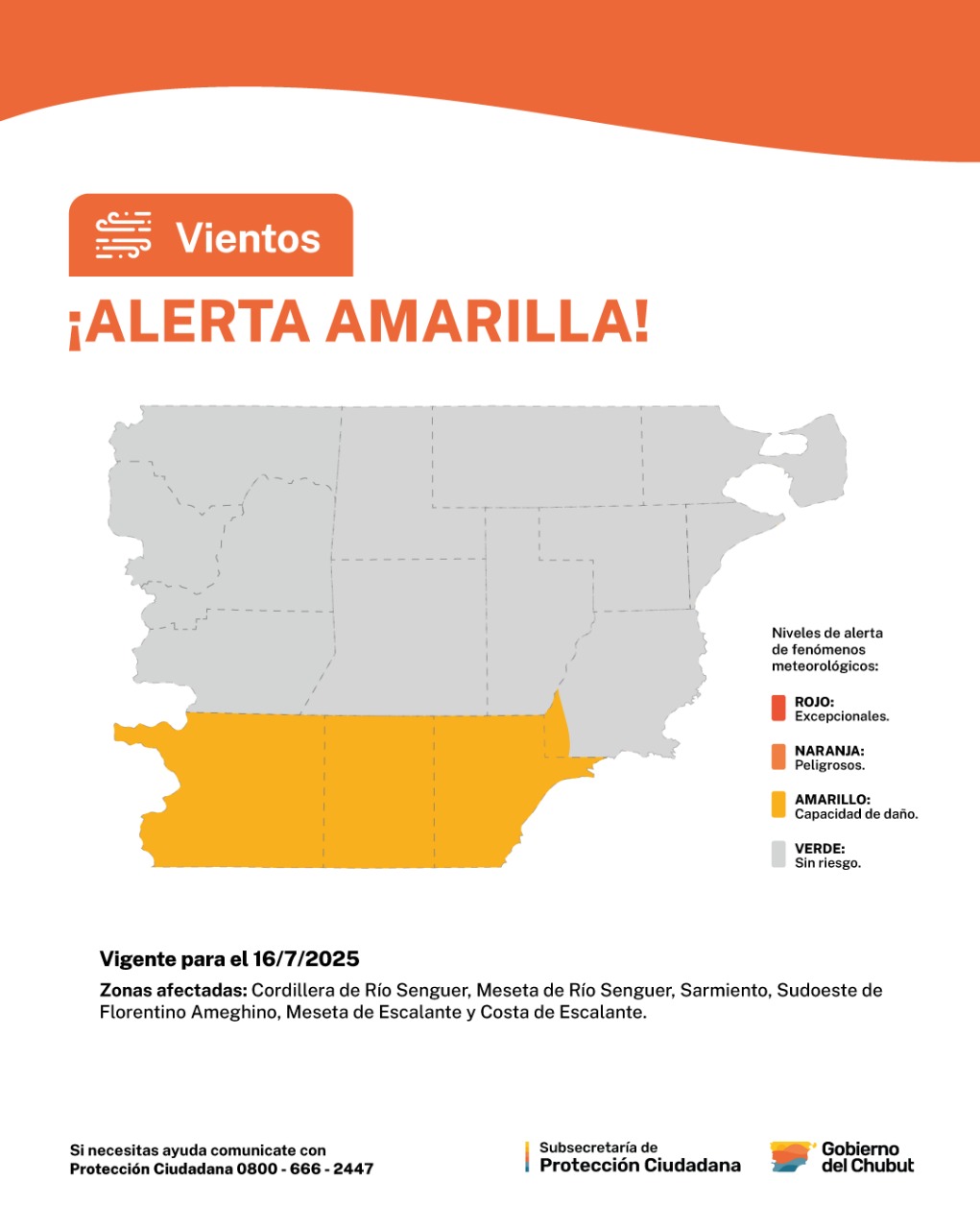 La Subsecretaría de Protección Ciudadana, dependiente del Ministerio de Seguridad y Justicia, informa que el Servicio Meteorológico Nacional emitió una alerta amarilla por vientos para la noche del martes 16 de julio.