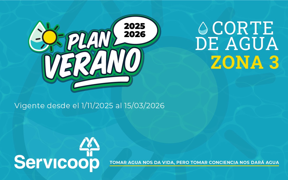 Servicoop informa a todos los usuarios y a la comunidad en general, que el elevado consumo superó la capacidad de producción y transporte de agua potable hacia nuestra ciudad, por lo que se debe activar el cronograma de cortes del plan verano, afectando para el día de mañana jueves 29 de enero a la zona 3. El abastecimiento se verá interrumpido desde hoy a la medianoche, hasta las 24:00 de mañana jueves. Recordamos que la zona 3 está dividida en sectores (A3 – B3 – C3) abarcando también a las Quintas del Mirador, Solanas de la Patagonia y Loteos Aledaños.
