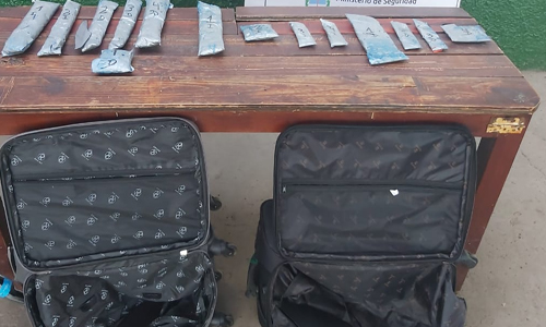 Al realizar la inspección, con apoyo del can detector de narcóticos «Gamal» -que reaccionó al estar en presencia de estupefaciente- los funcionarios constataron la existencia de 14 paquetes de diferentes tamaños (ocho en una valija y seis en otra), envueltos con cinta de embalar, ocultos en un doble fondo ubicado en los compartimientos laterales de dos valijas.