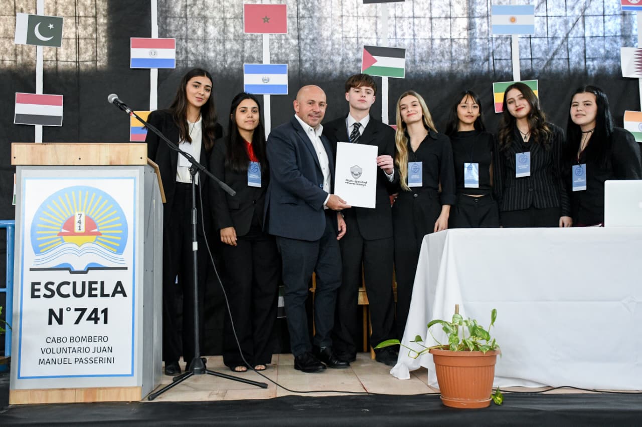 El intendente de Puerto Madryn, Gustavo Sastre, estuvo presente en la Escuela Nº 741 “Cabo Bombero Voluntario Juan Manuel Passerini”, donde se llevó a cabo una nueva edición del proyecto denominado “Modelo G77”, el cual se enmarca en una propuesta pedagógica que busca promover la formación ciudadana, la reflexión crítica y la participación activa de los y las estudiantes en torno a problemáticas sociales, políticas y culturales de alcance local, nacional e internacional.