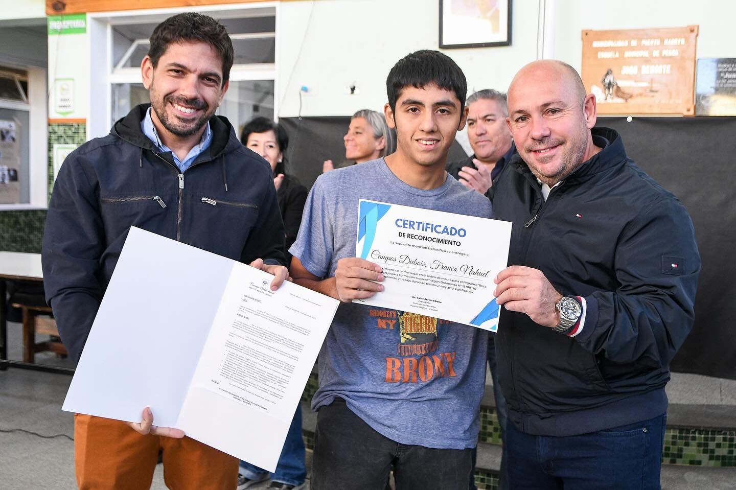 El Intendente de Puerto Madryn reconoció a Franco Nahuel Campos Dubois, quien obtuvo el primer puesto en el orden de mérito elaborado por la Comisión Evaluadora, mientras que Luciana Endara también fue destacada por su rendimiento académico