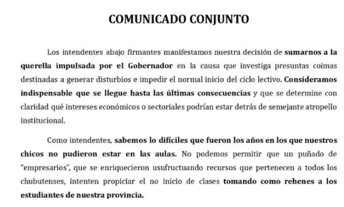 En el documento, los mandatarios locales remarcaron que conocen de primera mano “lo difíciles que fueron los años en los que nuestros chicos no pudieron estar en las aulas” y advirtieron que no se puede permitir que “un puñado de empresarios que se enriquecieron usufructuando recursos que pertenecen a todos los chubutenses intenten propiciar el no inicio de clases tomando como rehenes a los estudiantes”.