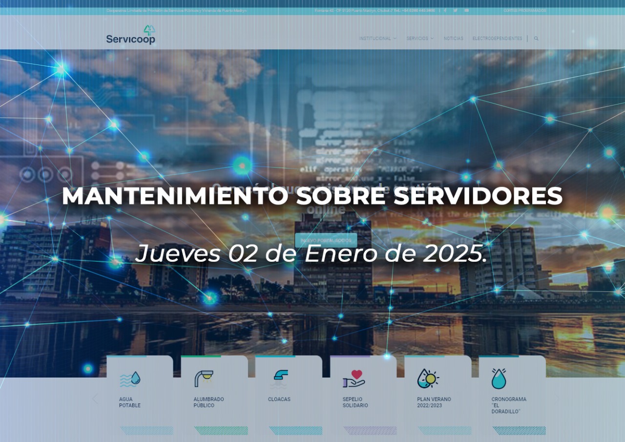 Servicoop informa a todos los usuarios y a la comunidad en general, que el día de mañana jueves 02 de enero, personal de informática llevará adelante tareas de mantenimiento sobre los sistemas digitales de administración, en los servidores. Por tal motivo, no habrá atención al público y sólo estarán activos los canales y medios de pago on-line habituales.