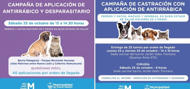 Por otro lado, el sábado 25 de octubre, de 13 a 14.30 horas, se desarrollará la campaña de aplicación de antirrábica y tratamiento desparasitario con el Quirófano Móvil en el Parque Bernardo Houssay, ubicado en Islas Malvinas entre Nueva León y Ceferino Namuncurá, en el barrio Patagonia. Se realizarán 40 aplicaciones por orden de llegada, hasta completar el cupo previsto.