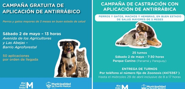 La jornada comenzará a las 7:30 horas en el barrio Roca, específicamente en la calle Rivadavia sin número, en inmediaciones a la Escuela 49. Allí se llevará adelante una campaña de castración que también incluirá la aplicación de la vacuna antirrábica. Para esta actividad se darán 25 turnos, los cuales deben gestionarse previamente de manera telefónica llamando al 4473367 (Dirección de Zoonosis), hasta el miércoles 29 de abril inclusive en el horario de 8 a 17 horas.
