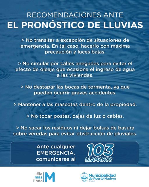 Desde la Municipalidad de Puerto Madryn, recuerda la alerta de precipitaciones para hoy jueves y mañana viernes
