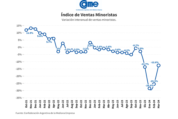 Las ventas minoristas pymes siguen en retracción. En marzo, bajaron 12,6% anual frente al mismo mes del año pasado, a precios constantes, y acumulan una caída de 22,1% en el primer trimestre del año. En la comparación mensual, disminuyeron 3,2%. Los comercios están atravesando meses delicados, con pocas ventas y subas de costos. Especialmente en marzo fue notorio el incremento en los montos de los servicios públicos. Aquellos locales más intensivos en el uso de energía, por ejemplo, como alimentos y bebidas, vieron saltar las cifras en sus boletas de luz.![]() A su vez, las familias vienen cuidando fuertemente sus gastos incluso cuando hay opciones de pagos con tarjetas o en cuotas. Hay incertidumbre sobre cuánto durará la recesión y por eso prevalece la precaución al momento de comprar.En el análisis por rubro, seis de los siete sectores evaluados tuvieron disminuciones en comparación con el mismo período del año anterior. Solo el sector de textiles e indumentaria, con liquidaciones muy agresivas, escapó a la tendencia general.Así surge del Índice de Ventas Minoristas Pymes de la Confederación Argentina de la en Mediana Empresa (CAME), elaborado en base a un relevamiento mensual entre 1.350 comercios minoristas del país, realizado del 3 y 5 de abrilAnálisis sectorialEn marzo, seis de los siete rubros registraron caídas interanuales en sus ventas. La mayor retracción anual se detectó en Perfumerías (-27,5%) y el único incremento estuvo en Textil e indumentaria (+10,2%). Alimentos y bebidas Las ventas bajaron 15,5% anual en marzo, a precios constantes y acumulan un retroceso del 28,7% en los primeros tres meses del año, frente al mismo periodo de 2023. En la comparación intermensual, declinaron 2,7%. Si bien desde los comercios señalan que se vendió poco y mal, su principal preocupación fue por el incremento en los costos fijos, especialmente en las boletas de luz, gas y también en los alquileres. Muchos negocios recompusieron precios que venían atrasados y en los segmentos medios, eso desplazó ventas hacia los hipermercados con mejores promociones. Empresarios consultados marcaron faltantes de lácteos, yerbas y azúcar. “Marzo debería haber sido mejor que febrero y fue peor, mucho peor, es el indicador que ilustra al detalle lo mal que nos fue” (Comercio de Godoy Cruz, Mendoza).“Estamos en un punto insostenible, o revierten las ventas o cerramos” (Comercio de San Salvador de Jujuy). Bazar, decoración, textiles para el hogar y muebles Las ventas se redujeron un 17,7% anual, a precios constantes, y llevan una caída de 20,3% en el primer trimestre del año frente al mismo periodo de 2023. En el contraste intermensual bajaron 6,7%. Se vendió muy poco, solo artículos de bajo valor o algunas cosas necesarias para reposición en los hogares. Lo mejor del rubro pasó por textil de cama, como sábanas, acolchados, almohadas, toallas, donde los comercios reportaron mejores números. En decoración y muebles, algunos empresarios manifestaron sorpresa por los bajísimos niveles de consultas de la gente.“Para entender lo que estamos pasando, en marzo no repusimos mercadería porque no vendimos casi nada” (comercio de la Ciudad de Buenos Aires).“Las ventas que tuvimos estuvieron asociadas a gente que no renovó alquileres y se mudó, entonces compro algo, pero solo cosas muy básicas” (comercio de la ciudad de Formosa).Calzado y marroquinería El retroceso fue del 5,9% anual, siempre a precios constantes, y suman así un declive del 16% en el primer trimestre 2023, en relación al mismo periodo del pasado año. Mientras que, en la comparación intermensual, el sector se retrajo un 2,1%. Hubo muchas ofertas para poder vender y generar liquidez, pero igual la relación entre el valor del calzado y el ingreso aún resulta alta. El inicio del ciclo lectivo reactivó el calzado escolar y deportivo, que tuvo un mejor mes que en febrero, pero no mejor que marzo del año pasado.“Marzo repuntó un poco con el fin de semana largo y al menos pudimos cubrir los gastos del mes, pero no fue bastante peor que el año pasado” (comercio de Mar del Plata, Provincia de Buenos Aires)“Vendimos muy mal, además estamos en una galería chiquita donde hay música, y este mes recibimos inspección de Sadaic, del ministerio de Trabajo y del municipio” (comercio de la ciudad de Mendoza).Farmacia Las ventas volvieron a desplomarse 21,9% anual a precios constantes, y acumulan una baja de 35,6% en el primer trimestre frente al mismo periodo de 2023. En tanto que, contra febrero, descendieron 3,8%. Hubo faltantes de repelentes, cremas y productos de algunos laboratorios. La gente buscó más que otras veces comprar remedios sin recetas sueltos, por unidades, como dos paracetamol, cosa que no todas las farmacias ofrecen. Otra situación llamativa fue el desdoblamiento de las recetas, donde la gente va al médico y si tiene que comprar más de un medicamento lo pide en dos recetas diferentes por si no tiene recursos para comprar las dos a la vez en función de los precios nuevos.“Tuvimos que reacomodar precios atrasados y eso nos mejoró los ingresos del mes, pero se vendió poco” (Farmacia de la ciudad de Resistencia, Chaco).“Vendimos todos los repelentes que teníamos y no más porque los proveedores no nos entregaron” (farmacia de Morón, en Provincia de Buenos Aires). Perfumería El derrumbe fue del 27,5% anual en marzo, a precios constantes, y acumulan una caída de 33,7% en los primeros tres meses del año frente al mismo periodo de 2023. En el contaste intermensual, la merma fue de 9,1%. Es el rubro que más viene bajando, porque los productos subieron mucho en los últimos meses y sienten el menor poder adquisitivo al no ser un producto esencial. Hubo muchas promociones, comercios que vendieron 2×1 y otros que aseguraron haber vendido un cuarto de las unidades que salieron en el mismo mes del año pasado.“Es insostenible la suba de alquileres, impues