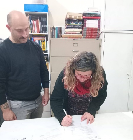 En la jornada de ayer, el presidente de la Junta Vecinal del barrio Luis Piedra Buena, Axel Visciglia, firmó un importante convenio de colaboración con la directora del Instituto Superior de Formación Docente Artística N° 805, Eugenia Piazza.
