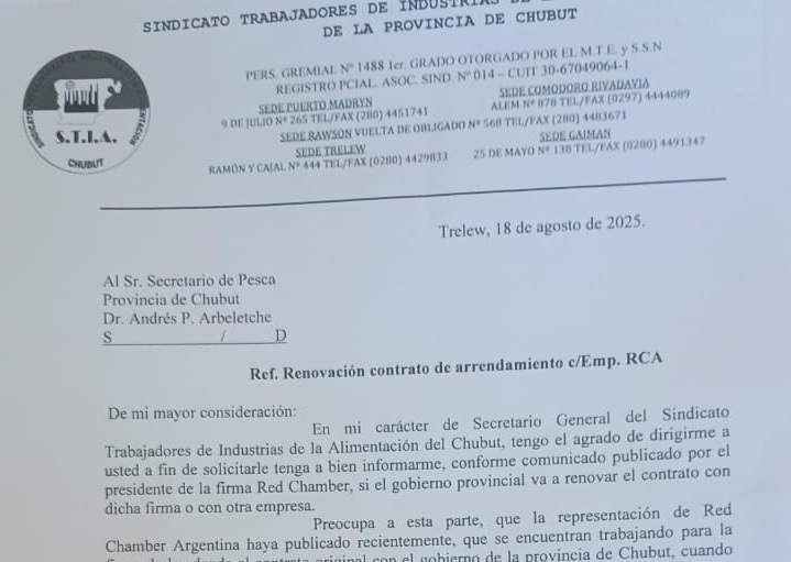 Luego de una serie de recurrentes incumplimientos por parte de la empresa Red Chamber, el Sindicato de Trabajadores de Industrias de la Alimentación (STIA) criticó en duros términos a la pesquera y exigió al secretario de Pesca de Chubut, Andrés Arbeletche, la rescisión del contrato para la explotación de los bienes de la ex Alpesca.