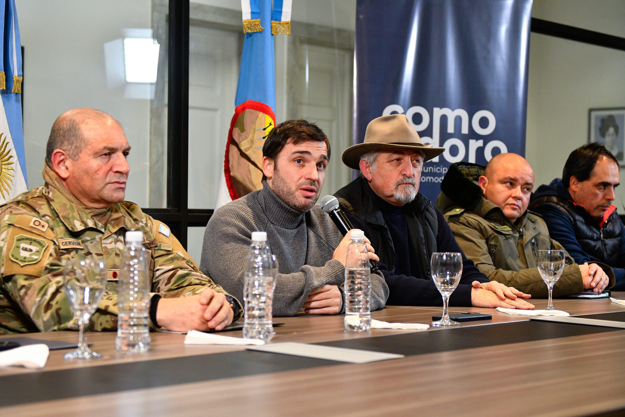 El titular del Ejecutivo provincial estuvo acompañado por el vicegobernador, Gustavo Menna; el intendente de Comodoro Rivadavia, Othar Macharashvili, el ministro de Seguridad y Justicia de la provincia, Héctor Iturrioz; el Coronel Mayor, y actual comandante de la IX Brigada Mecanizada del Ejército, Claudio Cervigni; el subsecretario de Protección Civil, Eduardo “Lalo” Perez; y el comandante de Gendarmería, Gustavo Gómez.